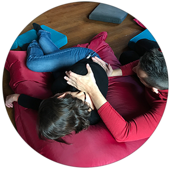 Throughout a period of 20 minutes, a person who is dressed and comfortably seated, is invited to experience contact and to briefly concentrate on his or her own corporal geography. The “dancer/ masseurs” go through postures creating “moving sculptures” between the two bodies. This process can happen in a public space, or be placed outside or inside a building.